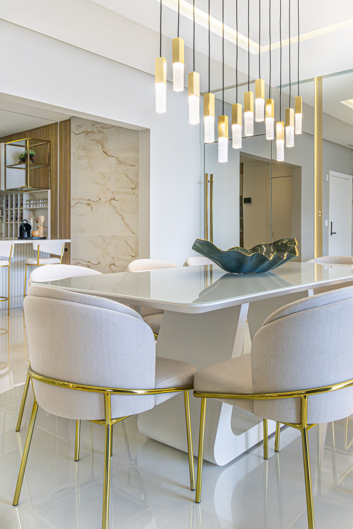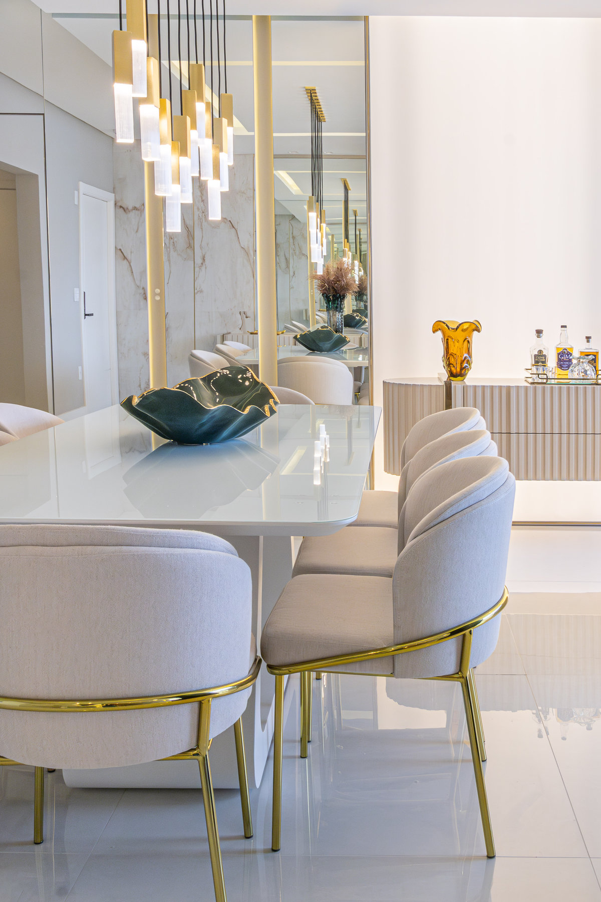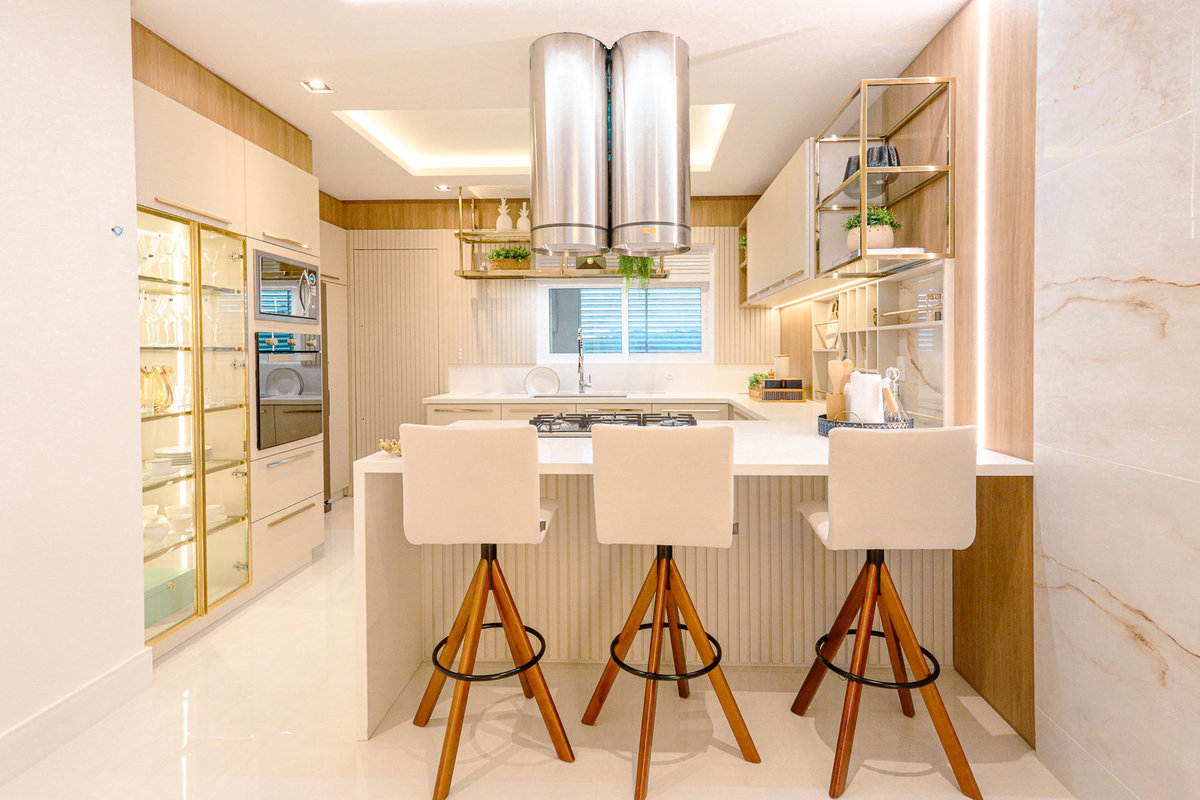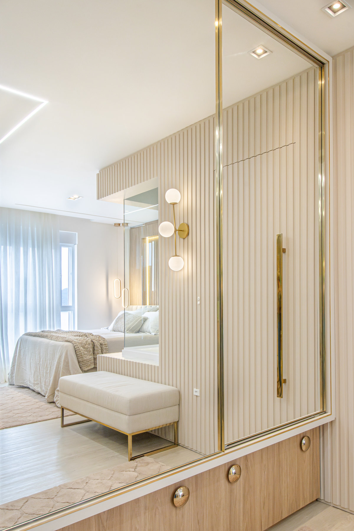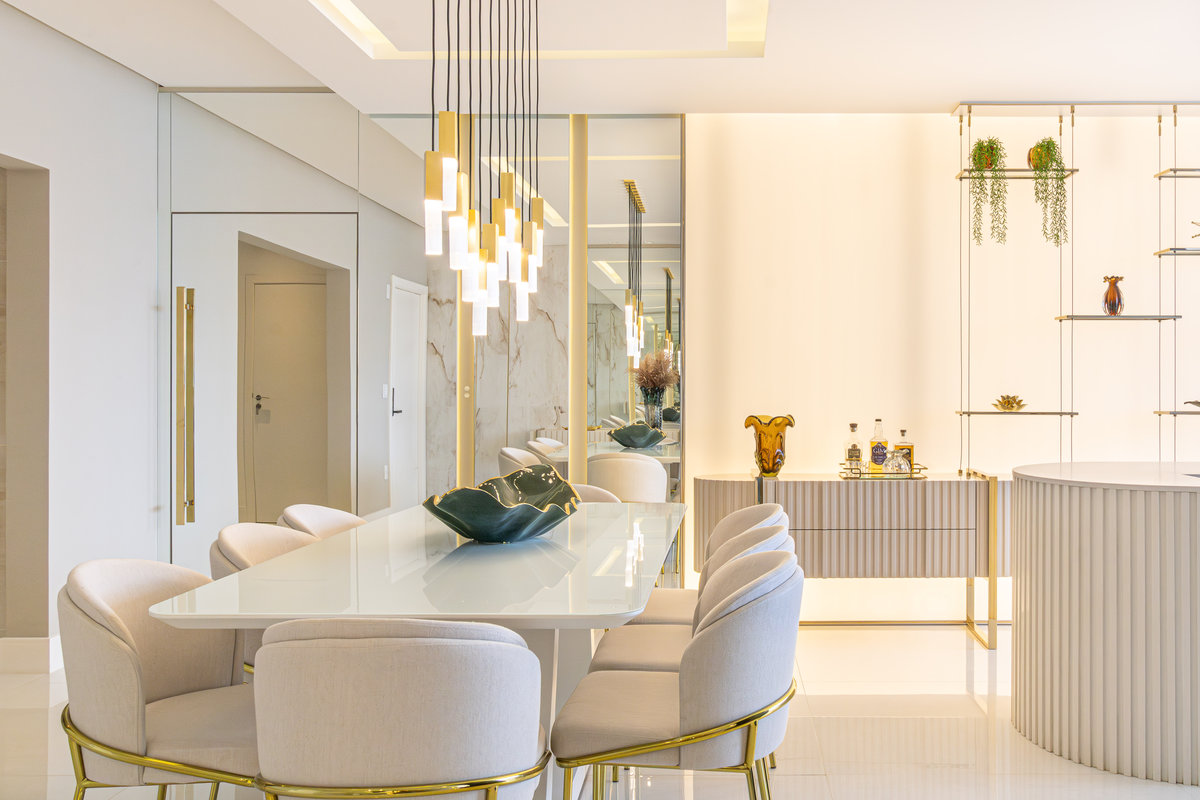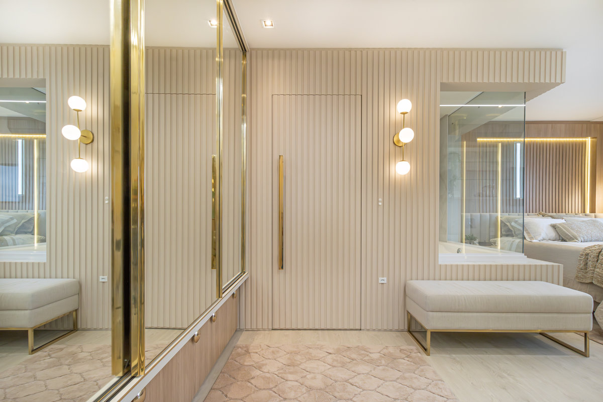 A composição de cores neutras e detalhes em dourado garantem sofisticação e elegância ao espaço. Focamos em elementos que dessem um ar de modernidade ao ambiente e trabalhamos com linhas retas, trazendo simetria e imponência ao projeto.