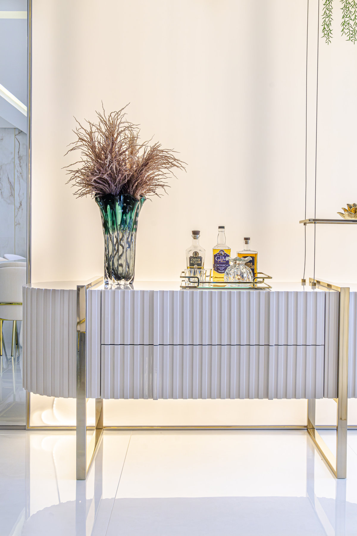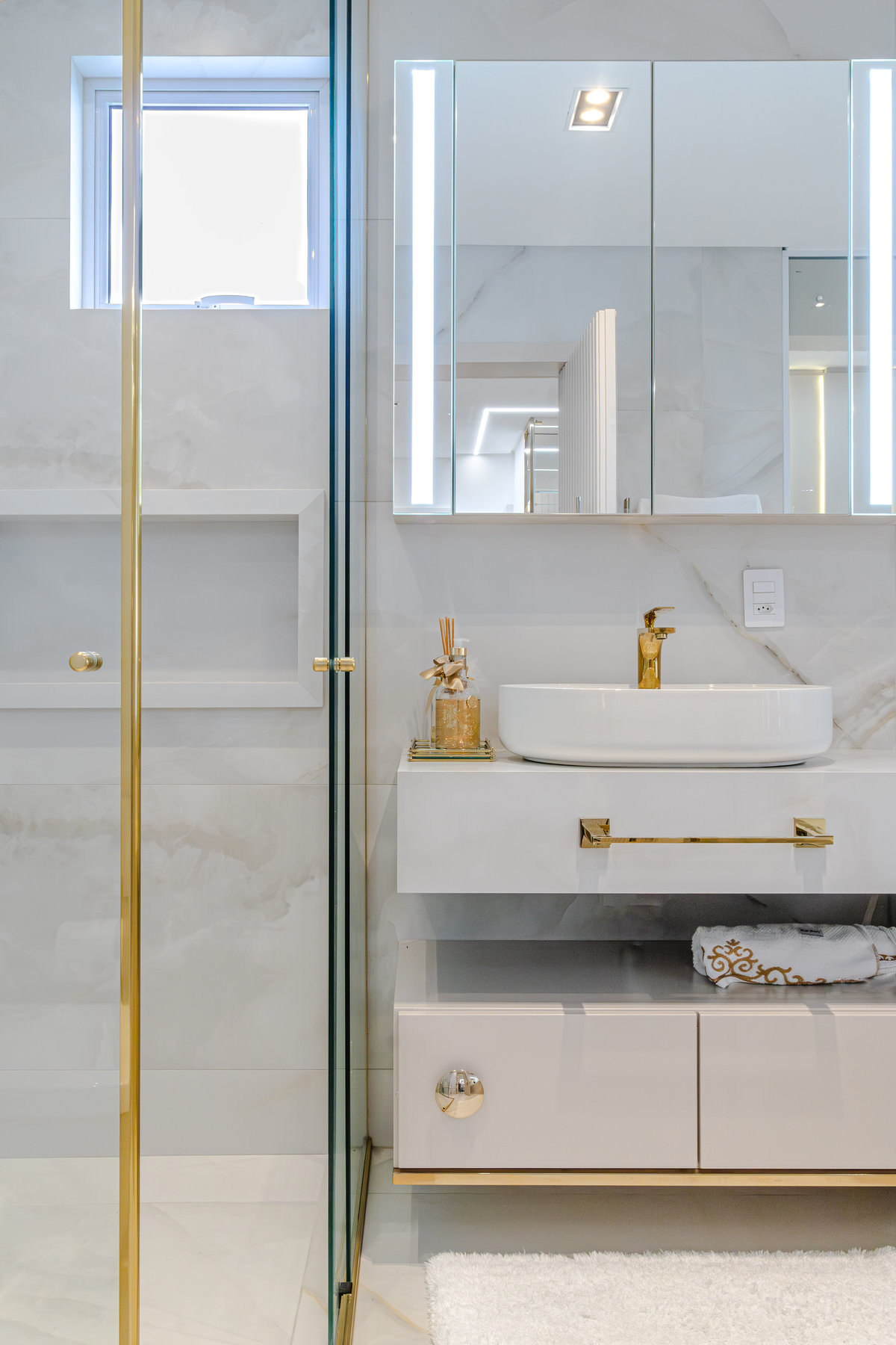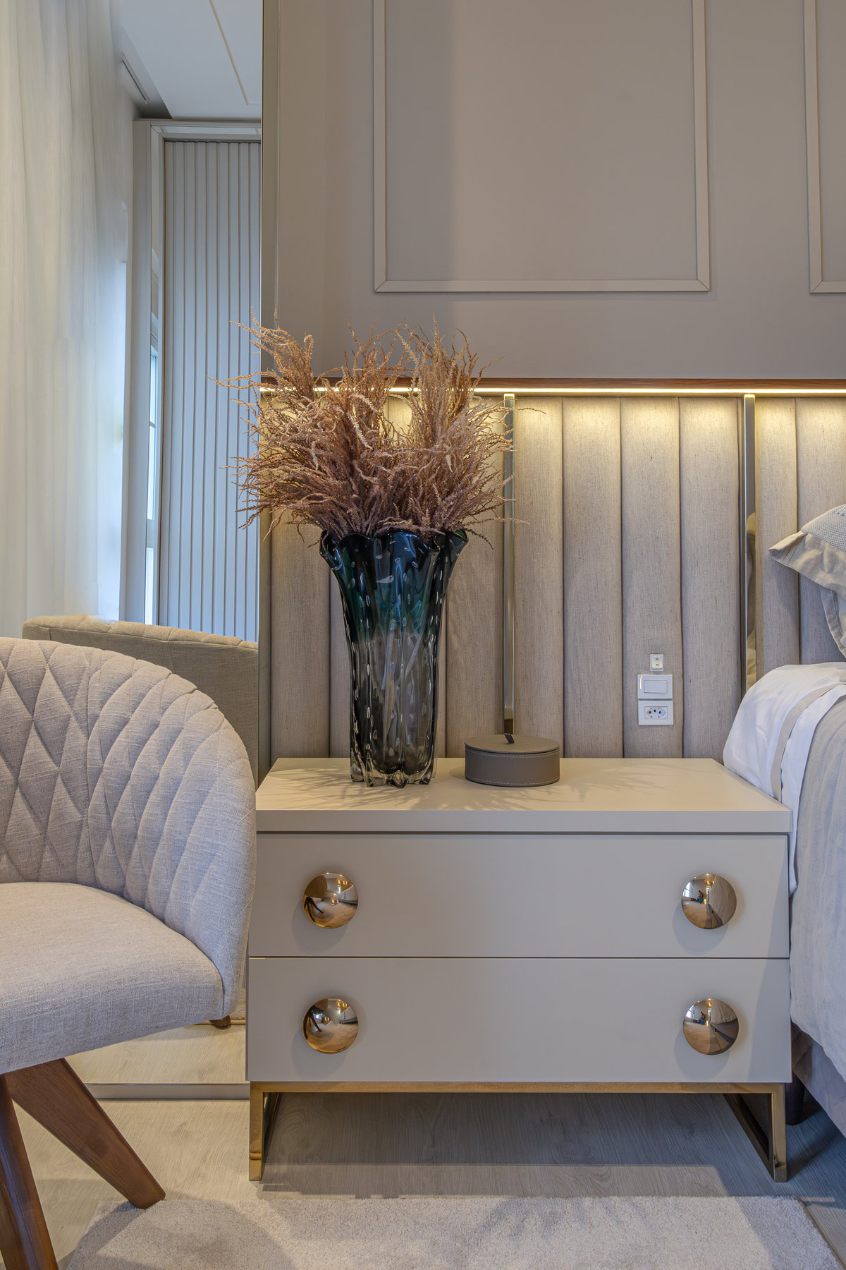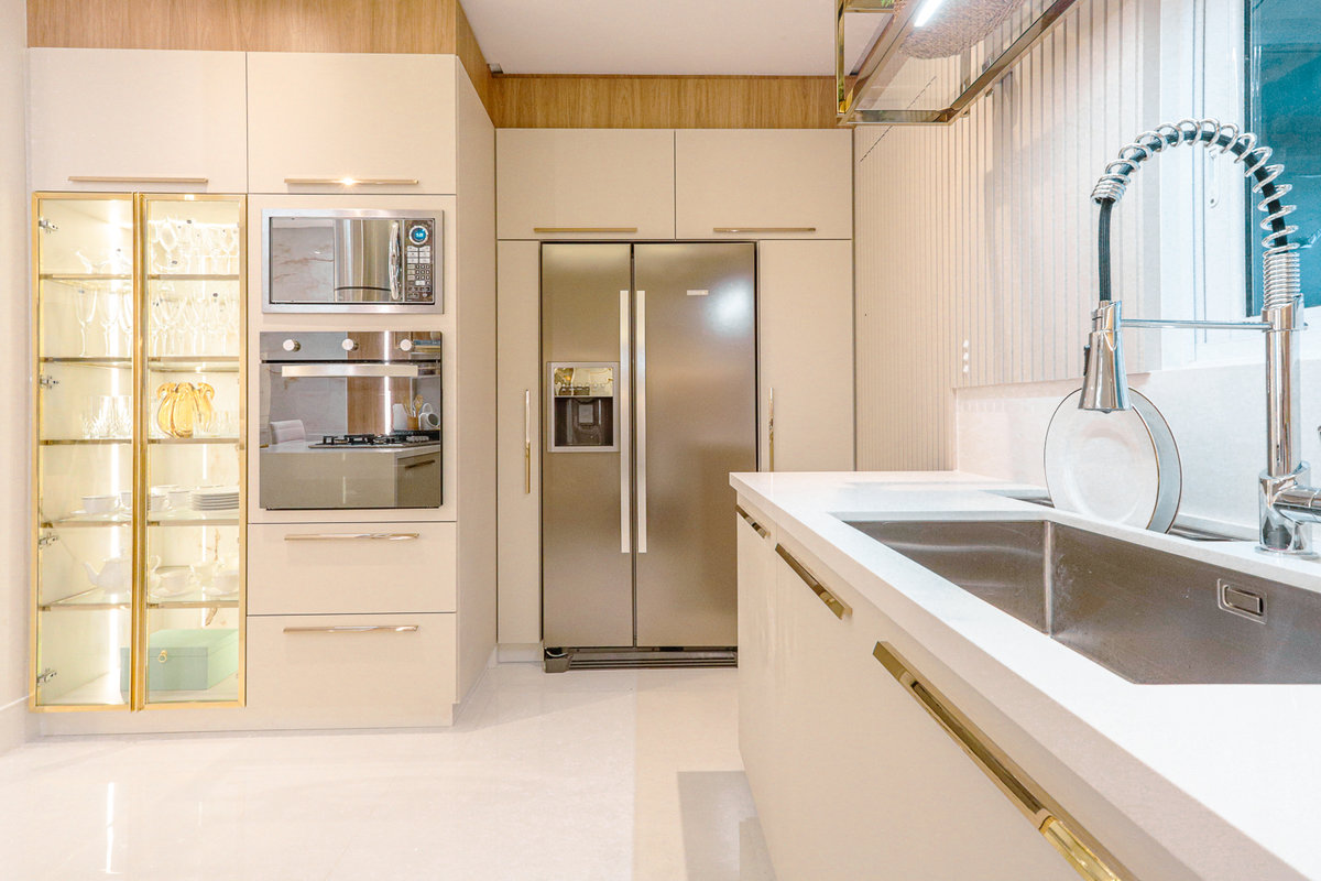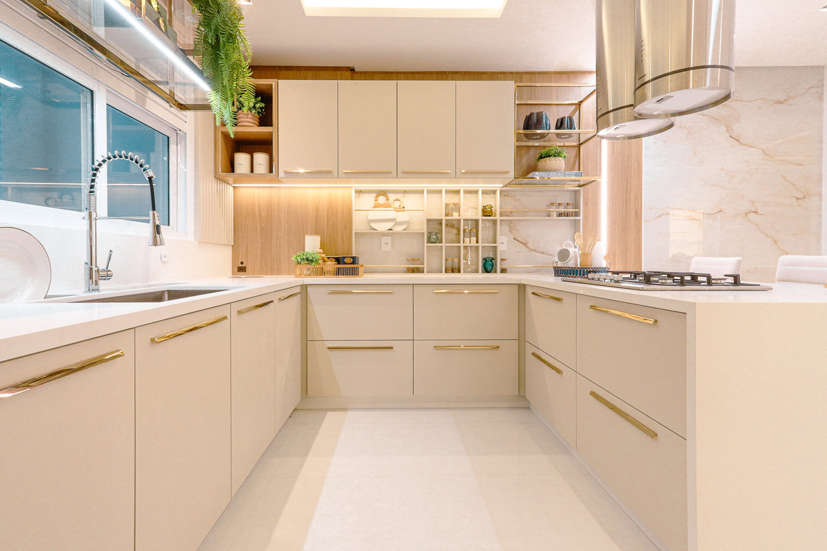 A composição de cores neutras e detalhes em dourado garantem sofisticação e elegância ao espaço. Focamos em elementos que dessem um ar de modernidade ao ambiente e trabalhamos com linhas retas, trazendo simetria e imponência ao projeto.