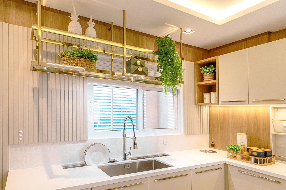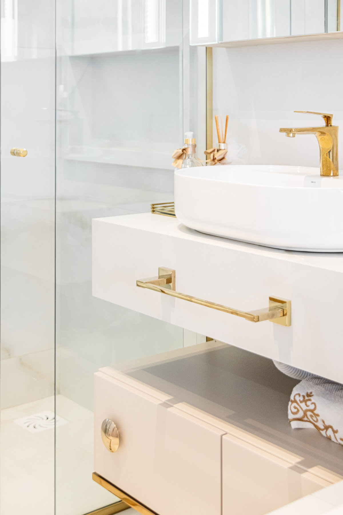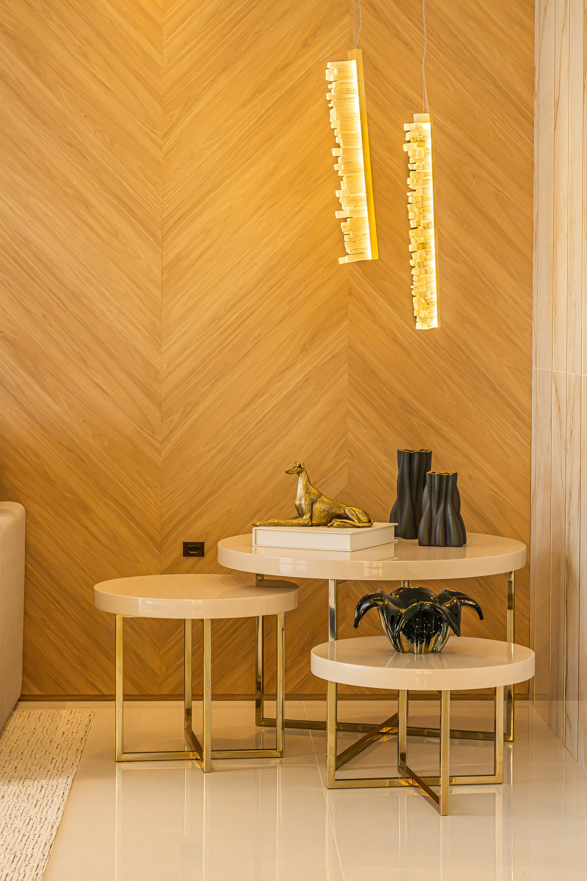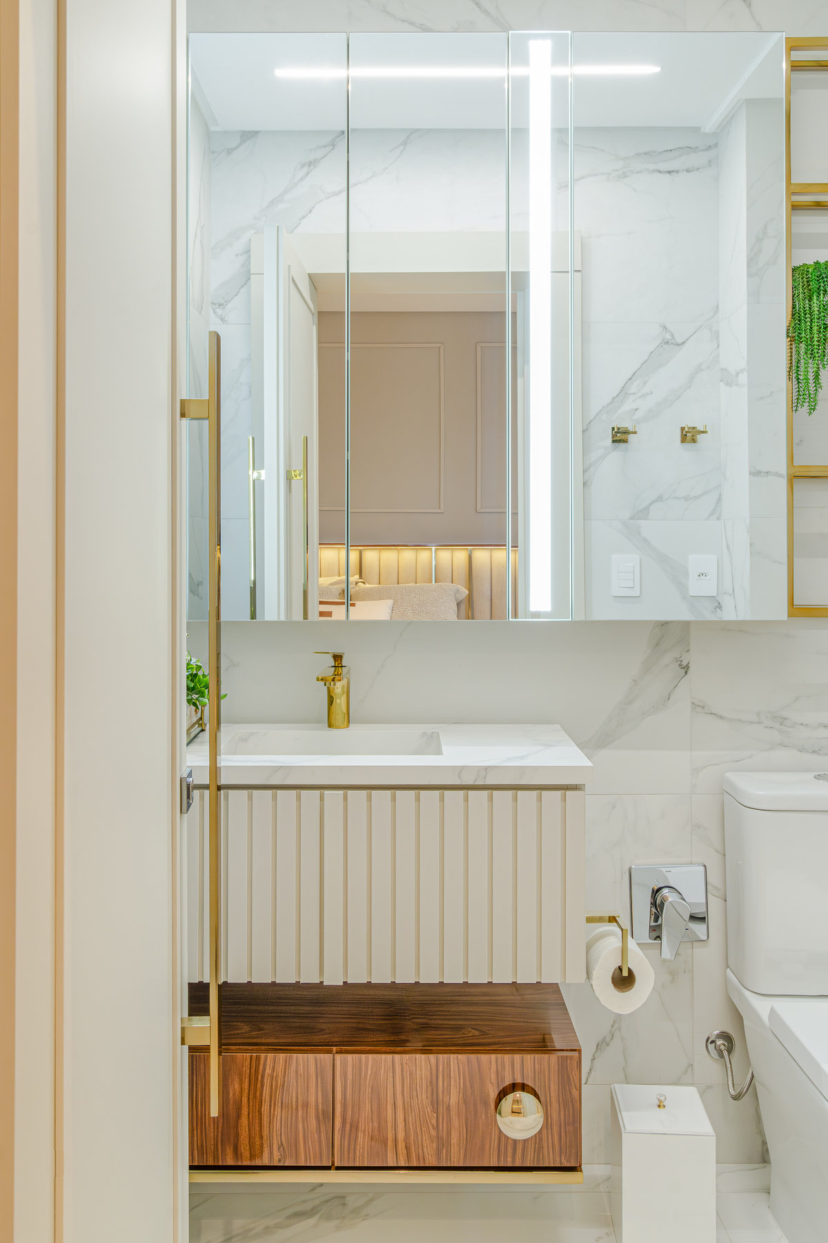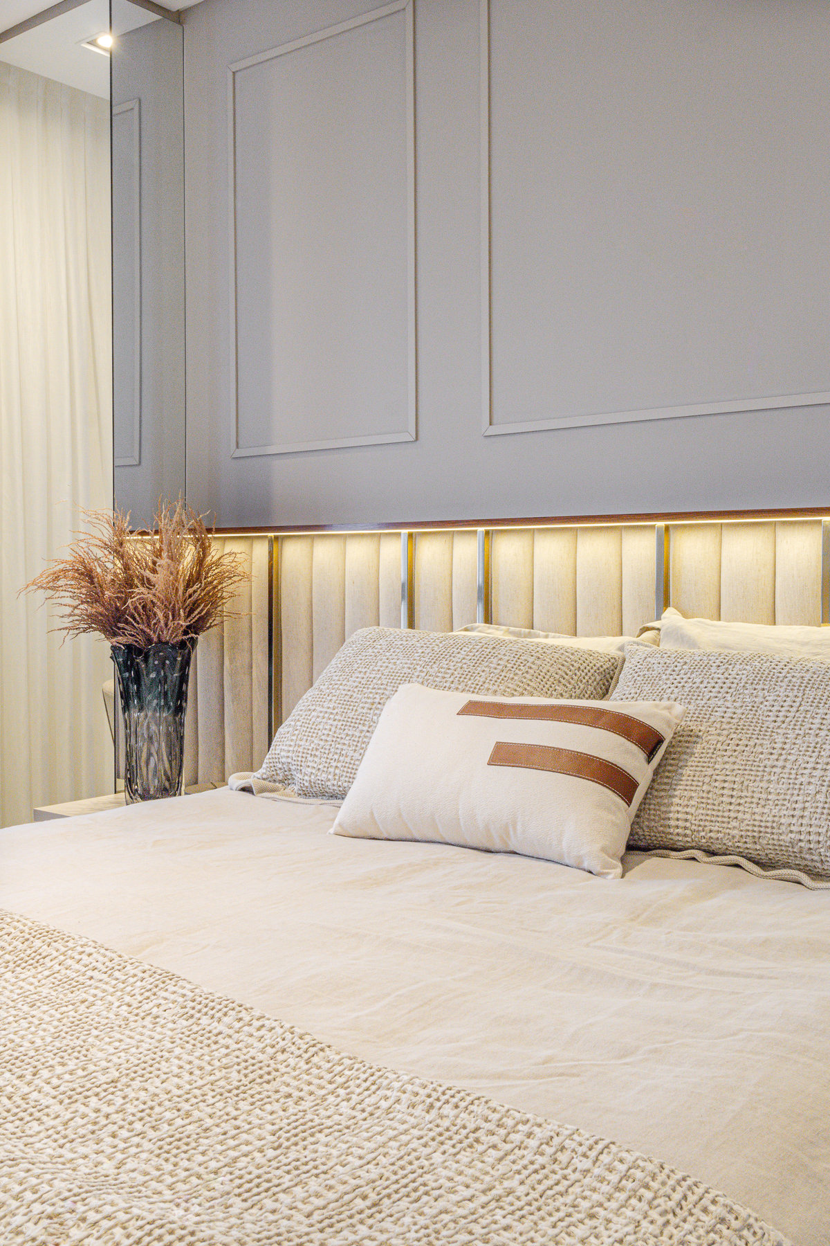 A composição de cores neutras e detalhes em dourado garantem sofisticação e elegância ao espaço. Focamos em elementos que dessem um ar de modernidade ao ambiente e trabalhamos com linhas retas, trazendo simetria e imponência ao projeto.