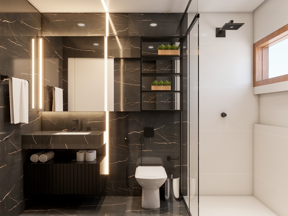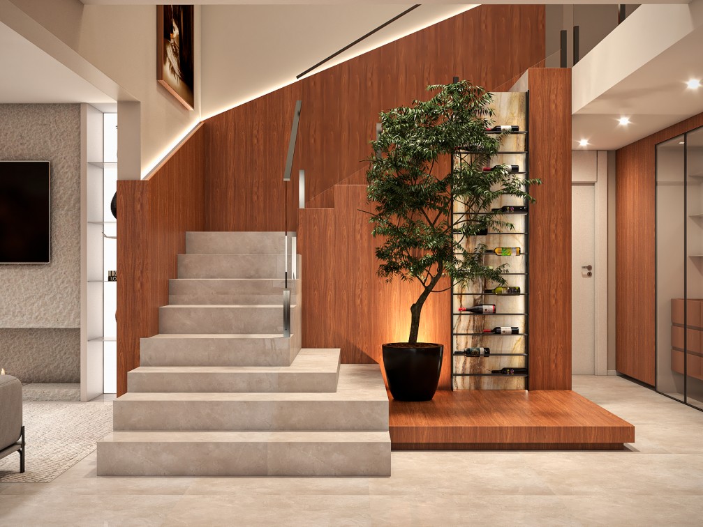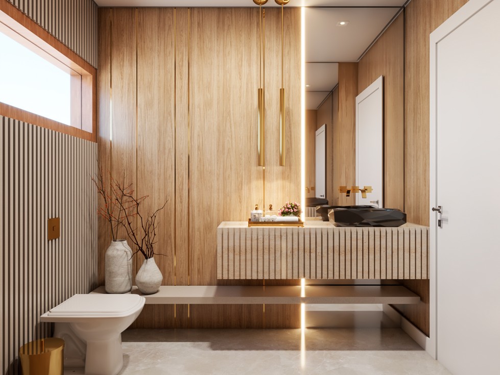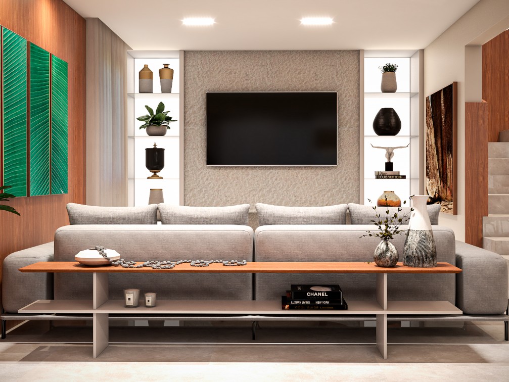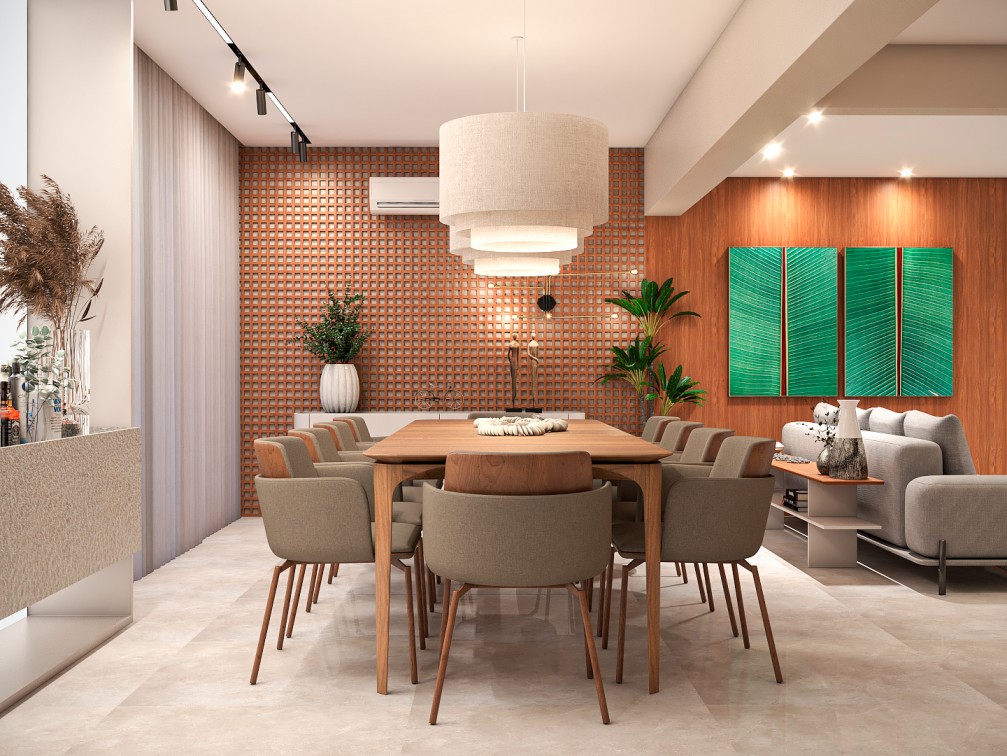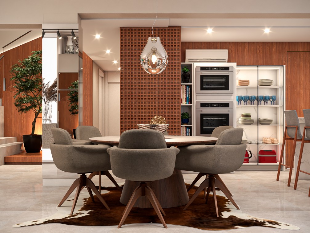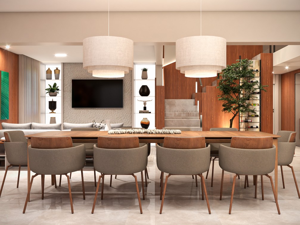 Dentro da casa, a área social é toda integrada e pensada para receber bem. Cores neutras e materiais naturais, como mármores e lâmina de madeira freijó natural, compõem o projeto lindamente.